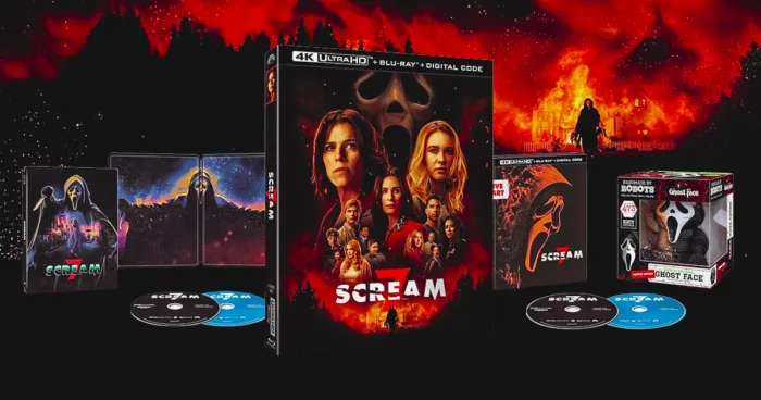 Scream 7 is coming home in multiple formats: Amazon exclusive 4K gift set, 4K steelbook, standard 4K combo, plus DVD and digital options.